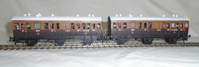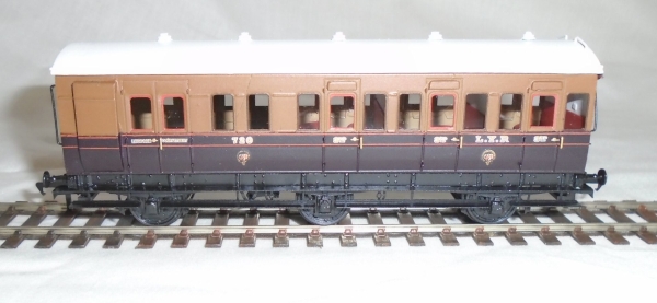 L&Y D8 Third/D7 Composite These two diagrams were built to a length of 33′, from 1892 and were outwardly identical, both having five compartments. They had arc roofs and were gas lit. The Composites were originally 1st/2nd/3rd, or 1st/2nd only but in the early 1900s the second class compartments were downgraded to thirds. 229 were still in use in 1921, but by 1933 only 11 were left. The last two were withdrawn in 1937.The kit is etched in brass, with plasticard roof and cast whitemetal detail parts. |