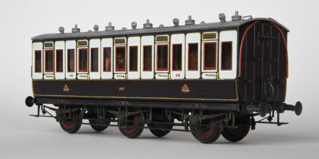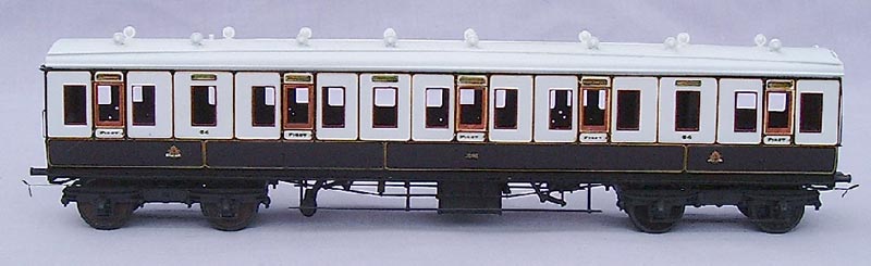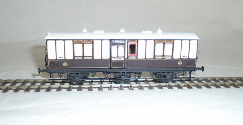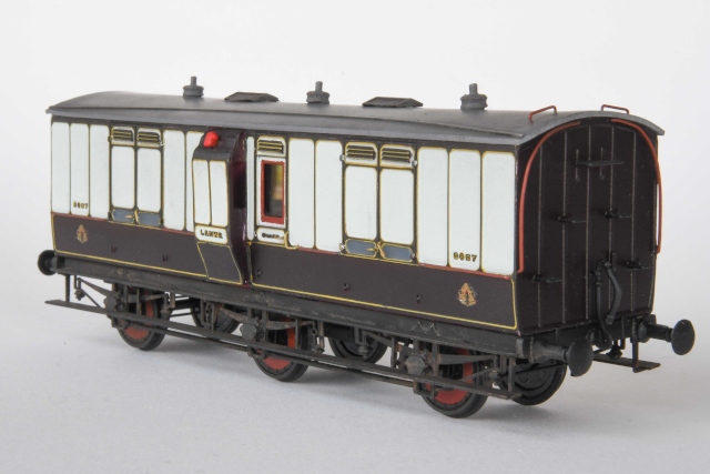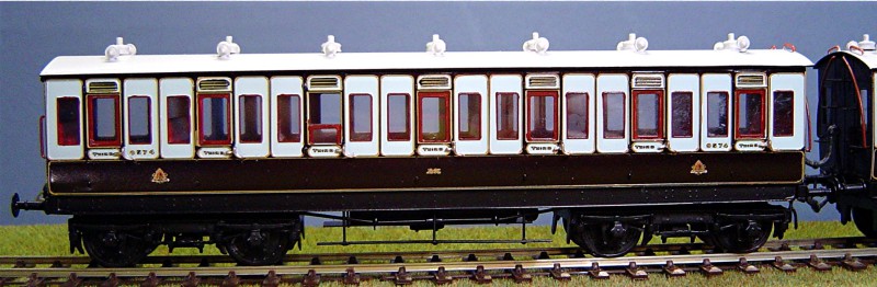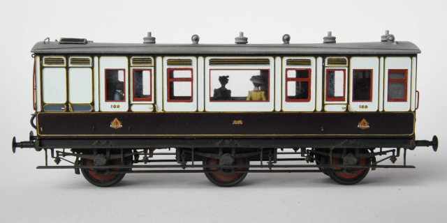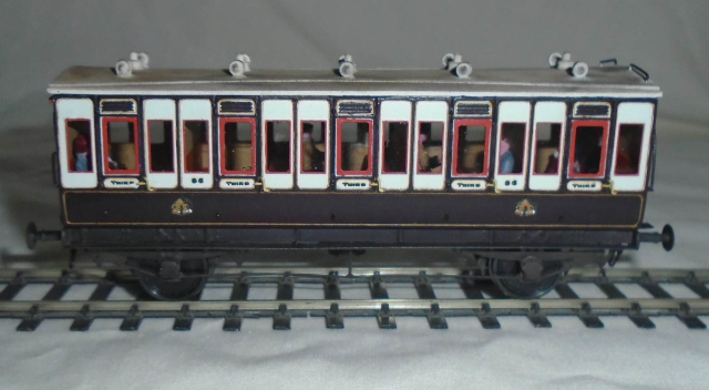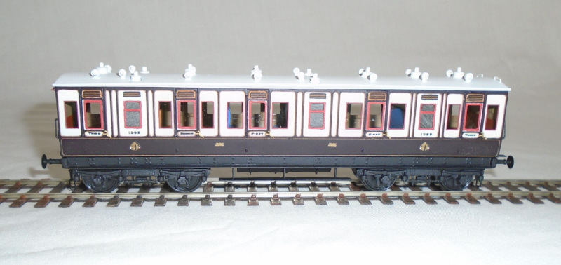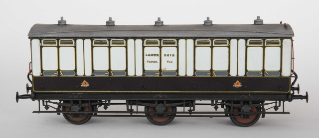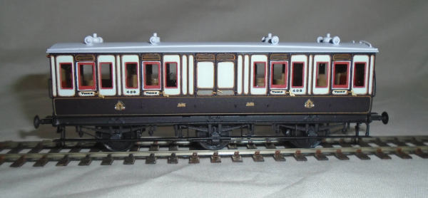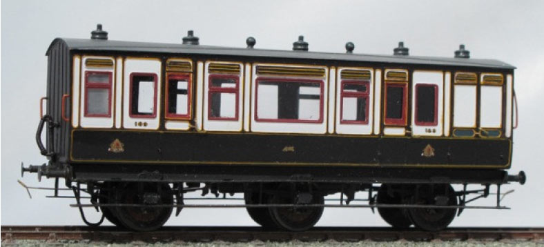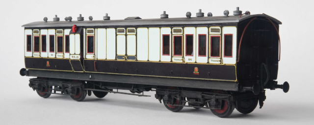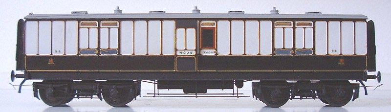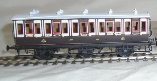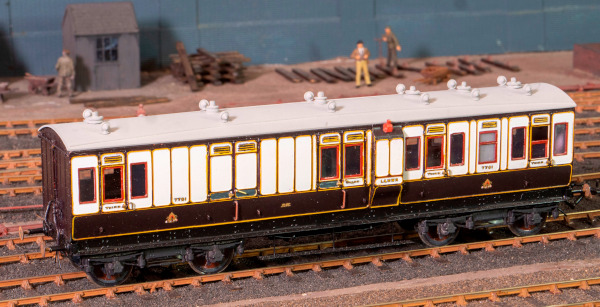 The other sets were painted in the standard LNWR carriage livery. Although close up photographs are not easily found, detailed written information of these carriages is available in the L&NWR Society Premier Portfolio No.7.The kit is etched in brass, with a preformed plasticard roof and cast whitemetal fittings. The underframe has built in compensation to allow for the long wheelbase.
