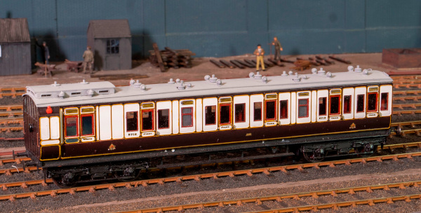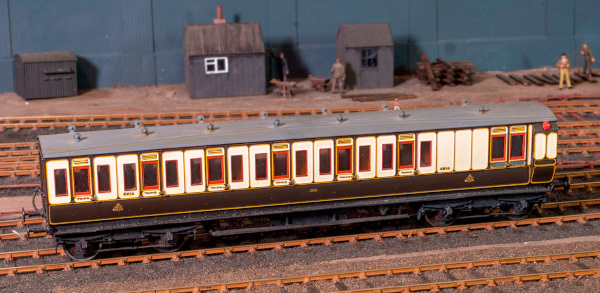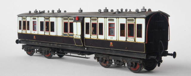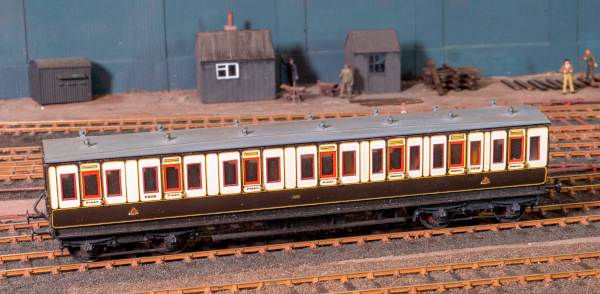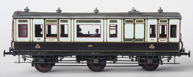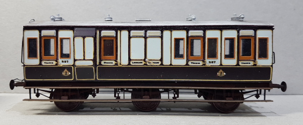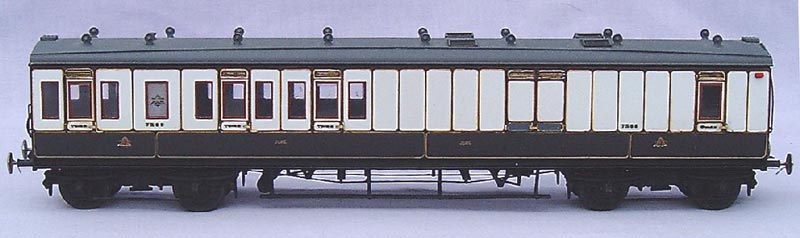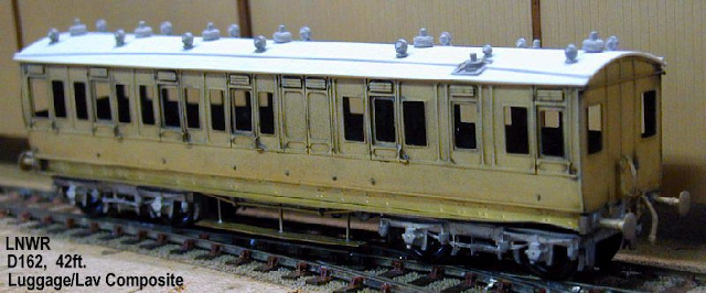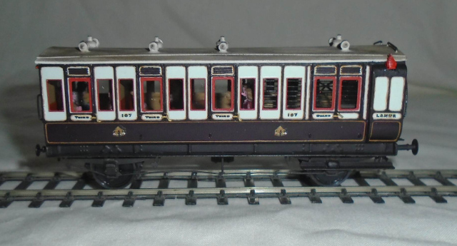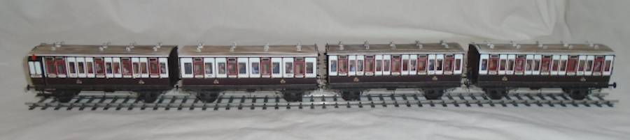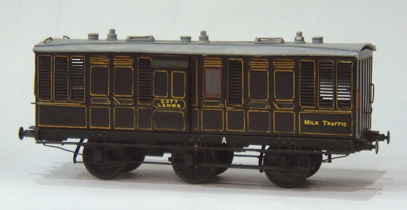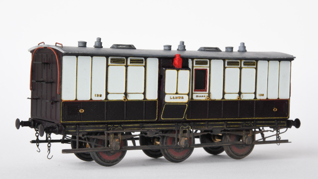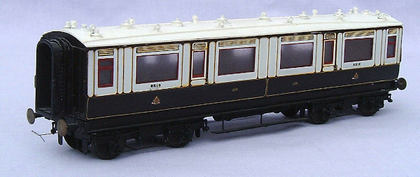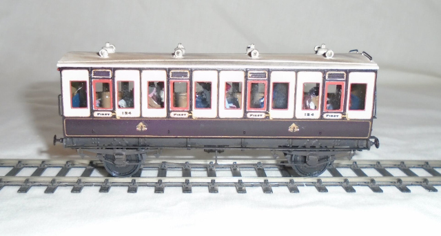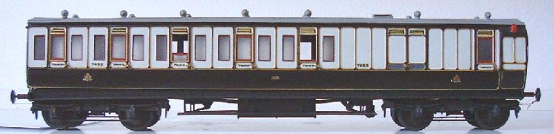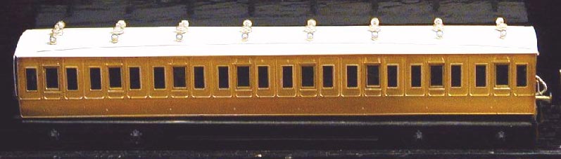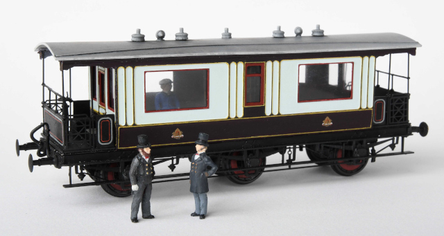 The other sets were painted in the standard LNWR carriage livery. Although close up photographs are not easily found, detailed written information of these carriages is available in the L&NWR Society Premier Portfolio No.7.The kit is etched in brass, with a preformed plasticard roof and cast whitemetal fittings. The underframe has built in compensation to allow for the long wheelbase.
