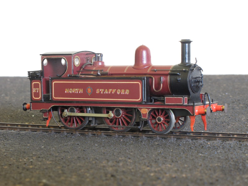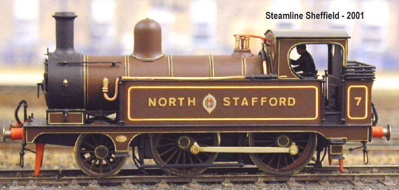 N.S.R./L.M.S. Class B 2-4-0T The North Staffordshire Railway built twenty one Class B 2-4-0 tank locomotives at their Stoke Works and followed on immediately after the Class “A” 2-4-0 tanks. They were used on suburban passenger workings, mainly out of Stoke on Trent. Production started in 1881 and was completed by 1895. They were rebuilt between 1897 and 1906, when a slightly larger boiler was fitted. At the same time those which had the early narrow cab were fitted with the more modern, wider version. They lasted well into LMS ownership, the last was withdrawn in 1935.The body is etched in brass, with a n/s etched chassis and produces the Class B in this rebuilt form. The loco fittings are a mixture of lost wax cast brass for the finer components, with high quality cast whitemetal for the larger, simpler, fittings.The detailed instructions included numbering and livery details. |