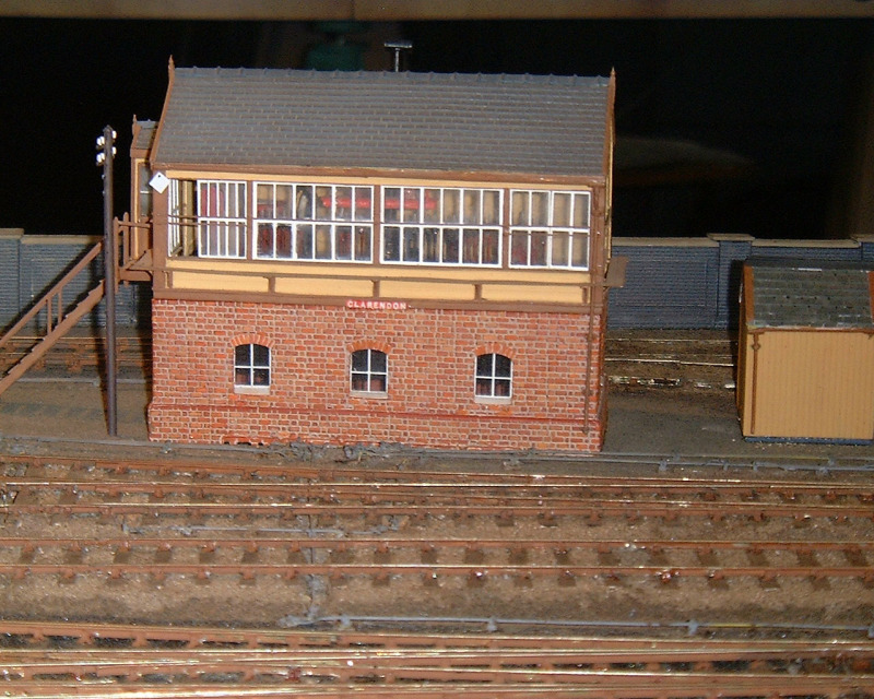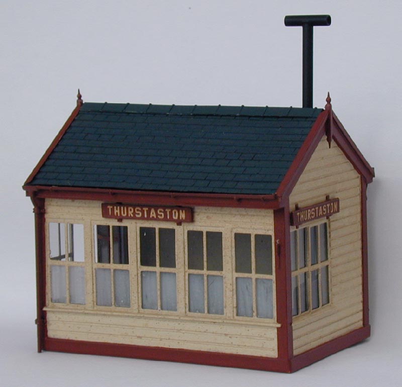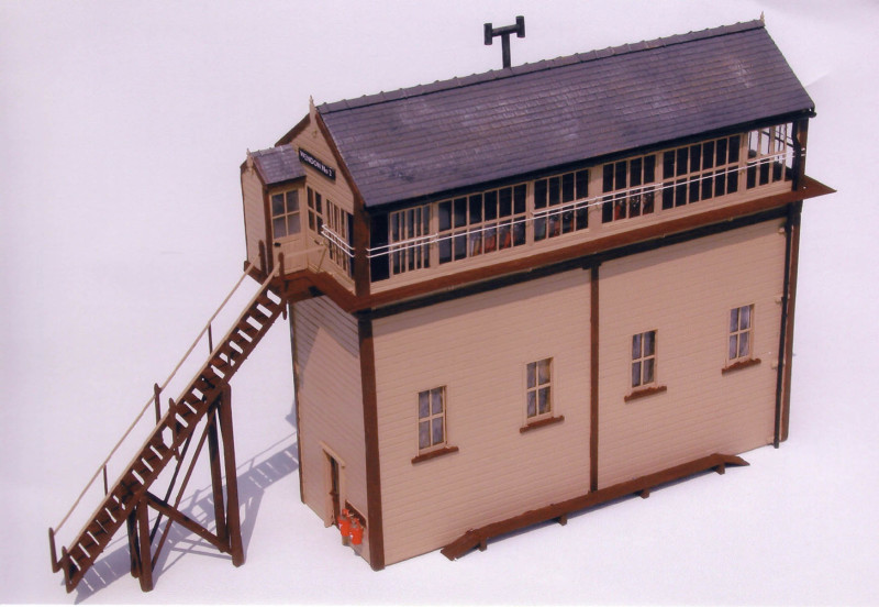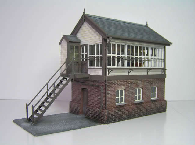 | SCT4 | LNWR Type 4 Signal Cabin The type 4 signal box was the standard LNWR design of signal cabin, which were built in large numbers from the mid 1870’s until the introduction of the Type 5 in 1904. The size of the cabin varied according to the number of levers which had to be accommodated, from 15 to 180. The prototype chosen (of which 200 were built) had 25 levers and could have either a brick or wood locking frame room or base, although stone was never apparently used. The etched brass kit provides the components to produce the upper part of the cabin, toilet, steps, etc. The locking frame room been left to the modeller to provide as this could be brick or timber, according to location and can be readily made from Wills scenic sheets. Alternatively, the cabin can be platform mounted or modelled as an overhead cabin situated on girders above the rails, as occurred in a number of locations. Wills Slate Roof sheeting is provided and the other architectural details, such as the locking room window frames are included on the etched brass fret. The kit includes a number of etched small details such as the brackets for the external walkway and the cabin equipment “in working order” plates. Cast brass finials are also included. We have also been able to include five sets of LNWR signal arms, spectacles and blinders on the etch. A variety of other sizes of cabin have been produced using this kit as the basis. For an example construction of the larger version used on the Clarendon layout, is featured in John Gowers’ article in Model Railway Journal No. 101, 1998. An example of a small platform mounted cabin made using our kit is also shown in the photos to the right. |