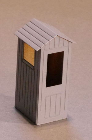 | LNWFH | Fog shelters were provided at signals to provide shelter for the fogman who would put detonators out to protect trains. This kit produces a Fogman’s shelter as shown in “LNWR Portrayed by Jack Nelson. During the summer months when not needed they could be found stored near signal boxes for maintenance. It is likely that the shelters were generally painted black, although typically few photos of such mundane items are hard to find. The photo shows the test etch model. Production etches have the door opening blanked out, as they normally appeared. The kit contains a .012″ brass etch to make one shelter and instructions. |